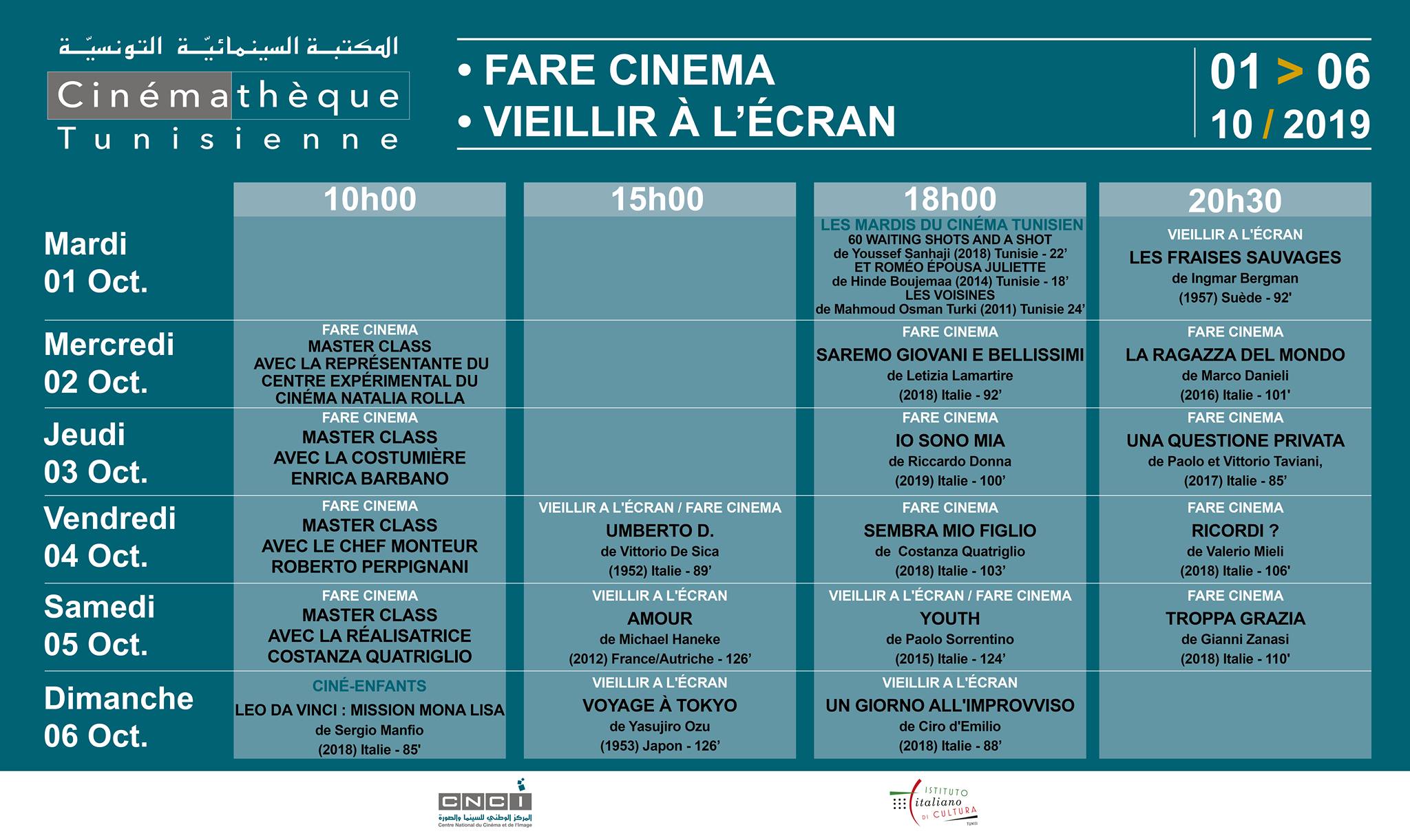 Fidèle à sa tradition, la cinémathèque Tunisienne choisit chaque semaine des thématiques qu’elle transpose à l’écran. Et pour cette semaine le choix est tombé sur la vieillesse au cinéma soit : « Vieillir à l’écran » et « Fare cinéma ».